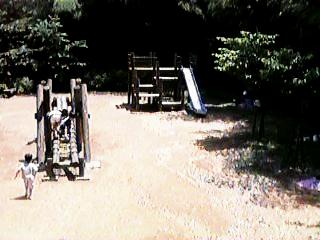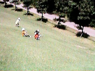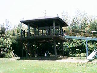 入り口近くの池 遊具はそれほどない 芝生の広場に四阿とローラースライダー 芝生の坂を転げ落ちて遊んでいる